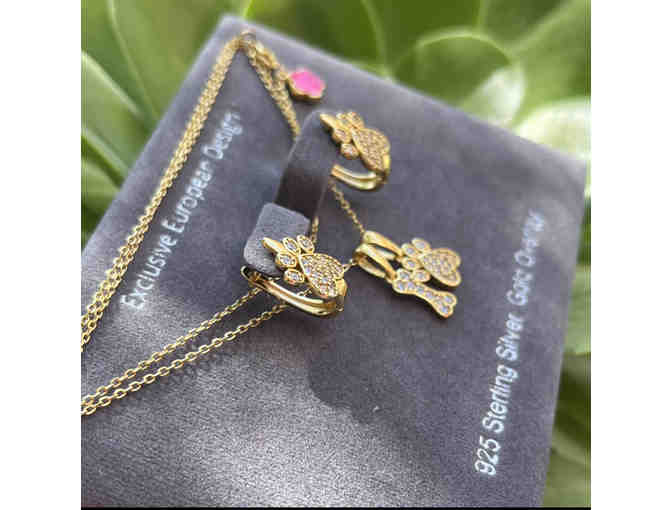 Add glamor to your day with these exquisite necklace and lever back earrings! Beautifully designed in California and finely crafted in solid 925 sterling silver with gold overlay and the world’s most desirable simulated diamonds ever created! Hypoallergenic. The necklace measures 18 inches, with adjustable length and lobster clasp, finished off with our signature Camelia flower detail on the back. Outstanding packaging for gifting or to hold your keepsakes! Created exclusively for the philanthropic community. Our jewelry goes through a special process, starting with high polish, followed by a coating of palladium, then platinum and finished off with a layer of rhodium or yellow gold. With A Purpose is known for: timeless elegant design, luxurious and everlasting quality.