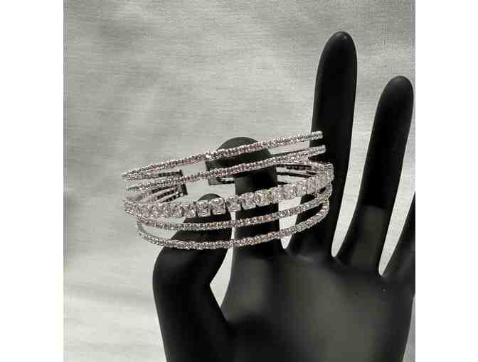 Designed to look like a stack of bangles, this silver-tone cuff bracelet has a modern appeal. It is studded with sparkling rhinestones for a glamorous touch.