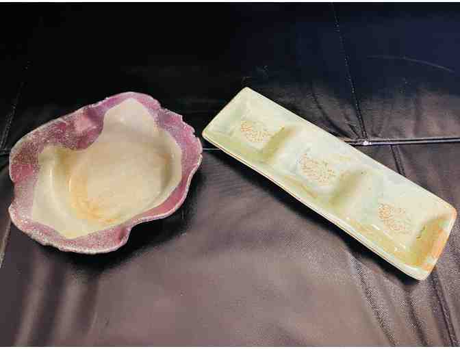 Three compartment handmade green dish that can be used for jewelry, candles, hors d'oeuvres. In addition, a beautiful handcrafted two-toned eggplant bowl that can be filled with treasures and love.
