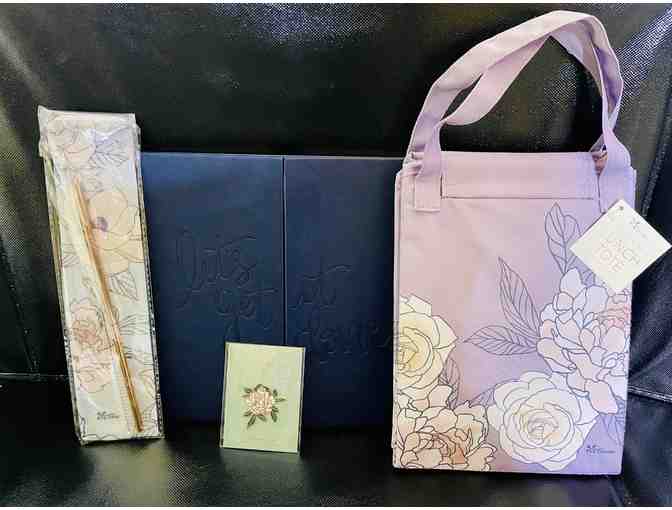 Eco-friendly Lunch Set includes an Erin Condren lunch tote, metal straw and cleaning brush with travel sleeve, embroidery sticker, and leather planner engraved with "Let's get it done". Be environmentally sustainable when bringing your lunch on the go.