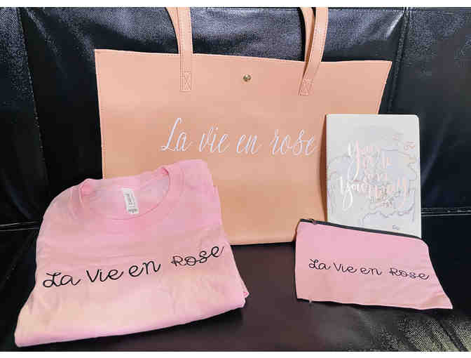 The life in pink! Travel in style with a large faux leather pink tote, a woman's small pink canvas tee, and small pink zipper make-up bag - all inscribed with "La Vie en Rose". Also included is an Erin Condren travel journal/planner with stickers. Tote made by Dreambags.