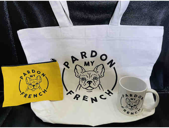 Pardon My French! Stylish gift set for the French Bulldog lover in your life. Gift includes "Pardon My French" coffee mug, white canvas tote bag, and yellow canvas make-up bag. Perfect for anyone who adores Frenchies (canine or human)!