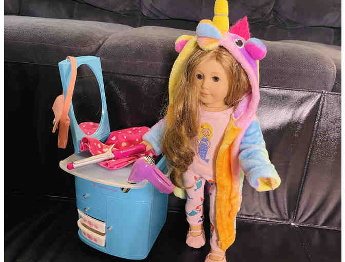 Does your child need a bestie to get dolled up for holiday tea time? Or to join for beauty treatments at the next slumber party? This American Girl doll comes with the Truly Blue Hairstyling Caddy and all its salon accessories, gently used but in excellent condition. Whether it's their first American Girl doll or the latest addition to their collection, this salon doll will inspire hours of imaginative play.