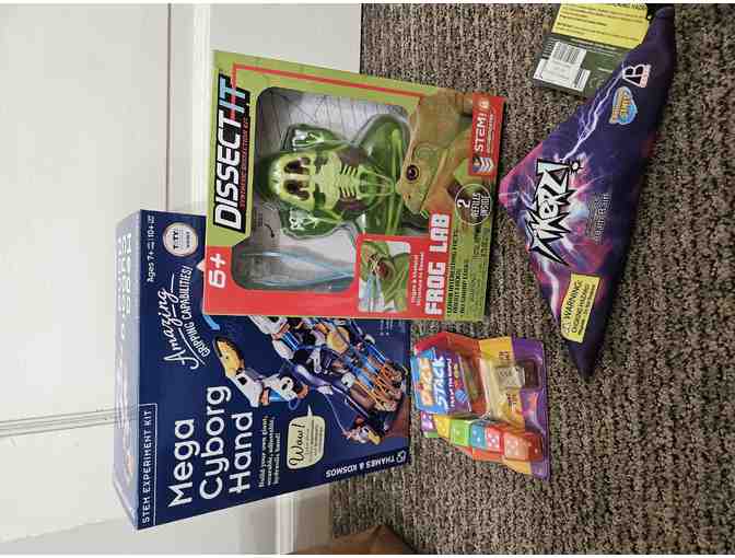 Perfect for gift giving!! This package includes a Mega Cyborg Hand STEM Experiment Kit, Dissect It Frog Lab, Yikerz Magnetic Board Game and Dice Stack Game. This a great combo to provide many hours of fun and learning!