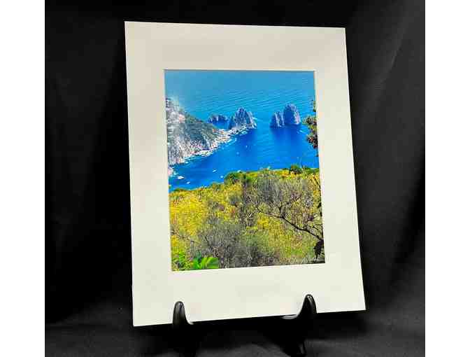 Colorful photograph of overlook Capri, with water, boats, rocky shore adn flower strewn hill. Generously donated by Raymond Johnson Photography.