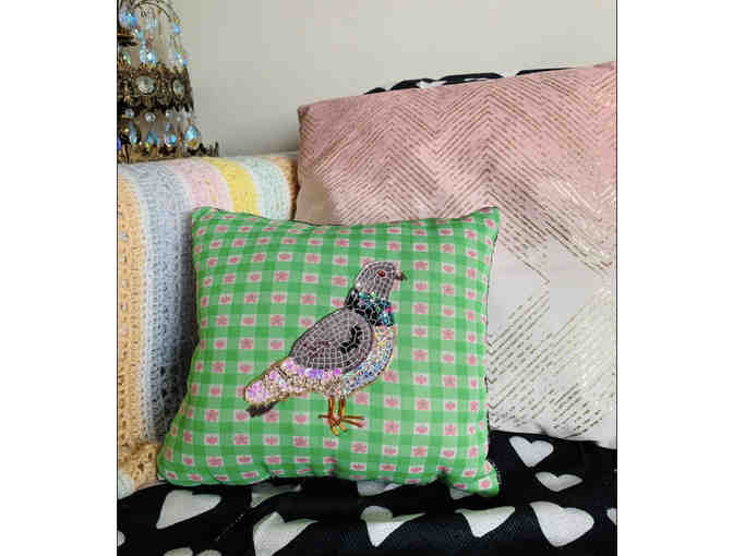 The pigeon is created from sequins and beads, sewn by hand one at a time. The pillow is stuffed using poly-fil and hand-stitched together. (Care