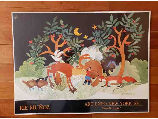 Rie Munoz poster of caribou and other animals in woods. "Peaceable Alaska" New York Art Expo 1984. 18" x 24"