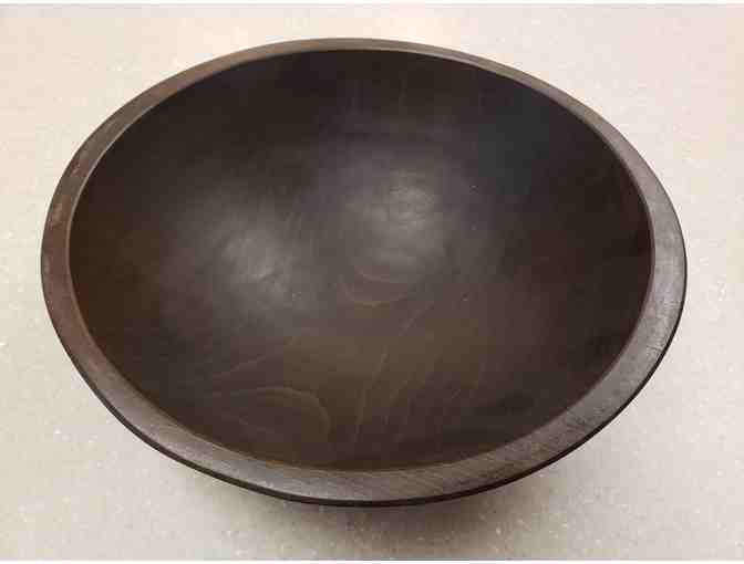 Dark wooden food safe bowl approximately 10 inches in diameter.