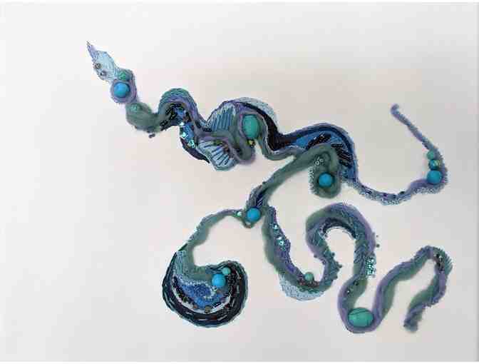 Embroidery, water color, stone and glass beads, and wool on canvas. Mixed media wall hanging that is rich in texture variation and splendid details.