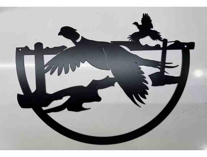 Precision laser cut out of 16 gauge steel, the flying Pheasant image is a great addition for a hunter or wildlife lover. It is powder painted in black and measures 16" in diameter. Both sides are finished so can be reversed.