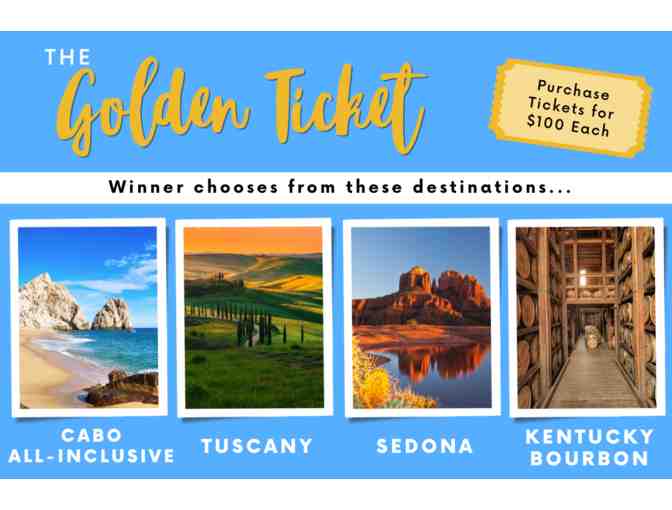 Buy a Golden Ticket or as many as you wish and you become eligible to win your choice of 1 of 4 great trip vacation destinations including Cabo All-Inclusive, Sedona, Tuscany + Wine, Kentucky Bourbon Experience. See full trip descriptions below.