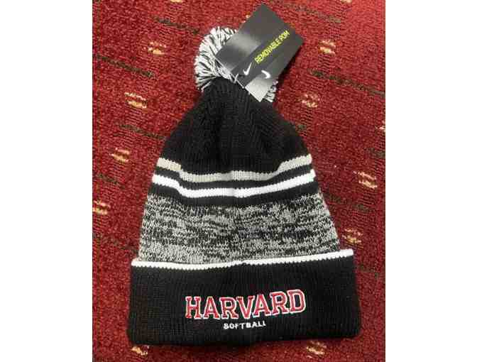 Grey, black, and white Harvard Softball beanie.