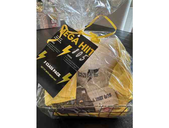 Gift basket includes 5 class pack gift card, Mega Hiit Hat, Grip Socks and Electrolytes!