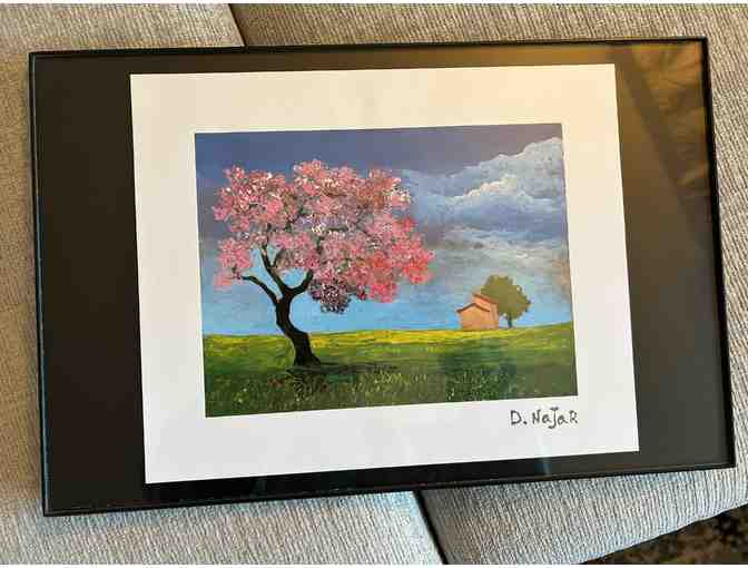 Bring a touch of nature’s beauty into your home with this stunning oil/acrylic painting of a cherry tree by artist David Najar. Capturing the tranquility of a blossoming tree in an open field, this piece blends vibrant colors and expressive brushstrokes to create a sense of peace and renewal. A perfect addition for art lovers looking to add warmth and elegance to their space.