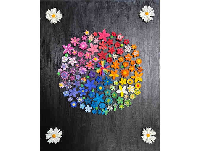 We love art projects that are created with items found in the classroom or home environment. And this is no exception! Ms. Heather, Mr. Jorge, and the children from Room 9 have made a project that features colorful hand-painted flowers on a canvas made of dried paper flower molds and toilet paper. How cool!