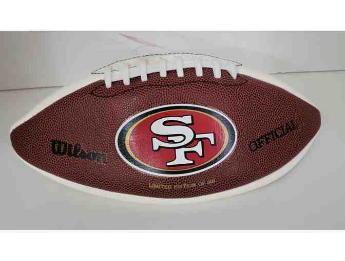 This is an official NFL-licensed white panel football featuring the stitched San Francisco 49ers team logo — an ideal piece for any 49ers fan or sports memorabilia collector!