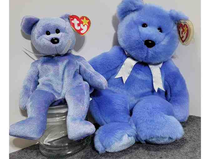 Double the charm with this adorable Ty Beanie Babies Clubby II set, featuring both the larger Buddy and the classic Baby Beanie versions! Dressed in a soft, shimmery blue fabric with a commemorative Clubby II emblem, these bears are perfect for collectors or anyone who loves a matching plush pair.
