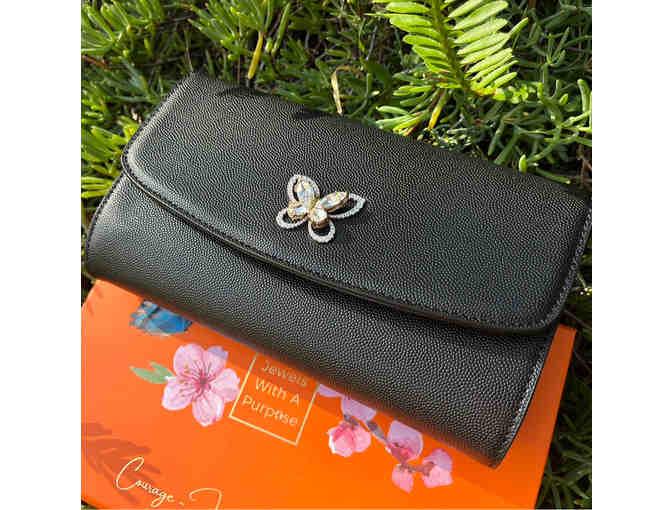 Introducing a limited-edition masterpiece designed exclusively for the philanthropic community. This elegant clutch, meticulously crafted in Italy, reflects the vision signature style of Jewels With A Purpose. Made from premium, vegan leather and adorned with exquisite accessories, this bag represents the pinnacle of luxury and conscious craftsmanship.