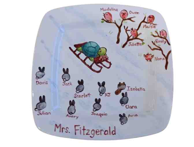 One of our Kindergarten students' favorite books, A Loud Winter Nap, comes to life on this adorable platter, personalized with "fingerprint" bunnies, birds, and a beaver. It’s a charming, unique piece that beautifully captures the story and asks the question, "Will the tortoise awaken?".