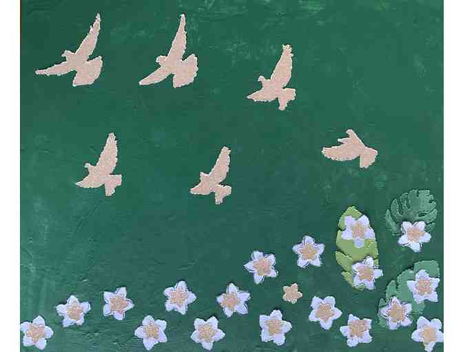 All the children painted the canvas, then pin-punched a flower or leaf. The Kindergarteners pin-punched golden birds, which soar above the tropical plumeria flowers below.