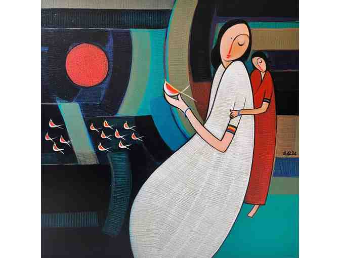 A true champion of child rights, Dattaraya T. Thombare believes in the importance of education for every girl. His latest exhibition was dedicated for all girls and his own daughter, to have the opportunity of a higher education. The award winning popular artist, lives and works in Mumbai. Studied at the J J School of Art, he often paints with the theme of the mother and child in vivid colours in his unique style.