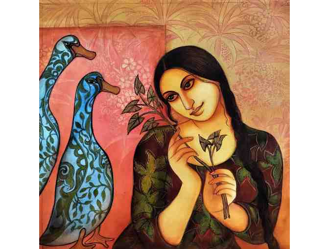 Born in West Bengal and raised in Jharkhand, India, Monlisa’s style of painting is both romantic and classic. Inspired by lush landscapes and the serene beauty of nature, animals and family bonding, she paints in vivid earthy colours, with the warmth of intricate bonds of human relationships. Monalisa lives and works in Kolkatta, and she has exhibited vastly.