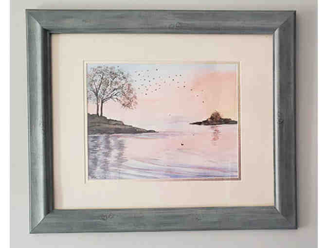 This framed 18" x22" water color of a gorgeous sunrise at Lee's Rocks at West Beach by the talented Nancy Nichols.
