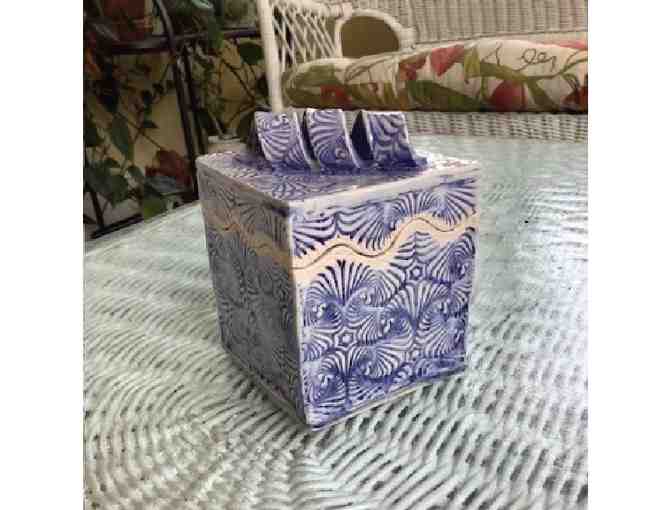 Handmade pottery designed, painted and fired by Beverly Farms artist Chris Bertoni. All works are original and made by Chris at the Clay Dreaming studio in Beverly. This lidded Keepsake Jar with a white and blue glaze is just the right size (4.5” x 3.25” x 3.25”) to hold your cherished items.