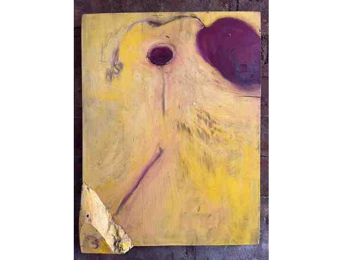 This beautiful abstract in yellow and purple is oil painted on wood panel. The bottom left has a 3-dimensional piece applied. It was painted by the late locally known artist Meg Carlon (1966-2014). It measures 11.75”H x 15”W.