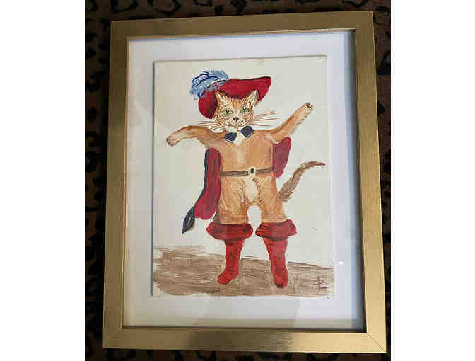 Whimsical original painting of a kitty all dressed up in costume, painted by a local Saugerties artist -- acrylic on canvas, gold tone frame.