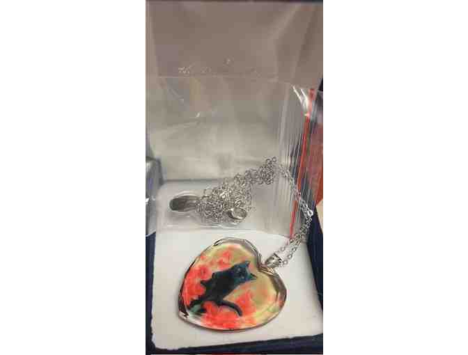 The pedant's romantic heart shape enhances the cat's natural beauty, and the exquisite pattern precise facets gives the pendant the distinctive look of precious cut glass. The artwork is visible from both sides.