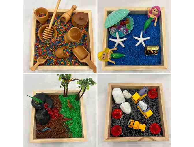 The winning bidder will choose one of the four kits pictured: Wooden Tools, Dinosaur Adventure, Construction Zone or Mermaid Treasure. Kit includes: 1 Medium Size Plastic Bin, 4 Bags of Rice & 1 Tools Bag (Wooden Tray not included). Rice color is customizable.