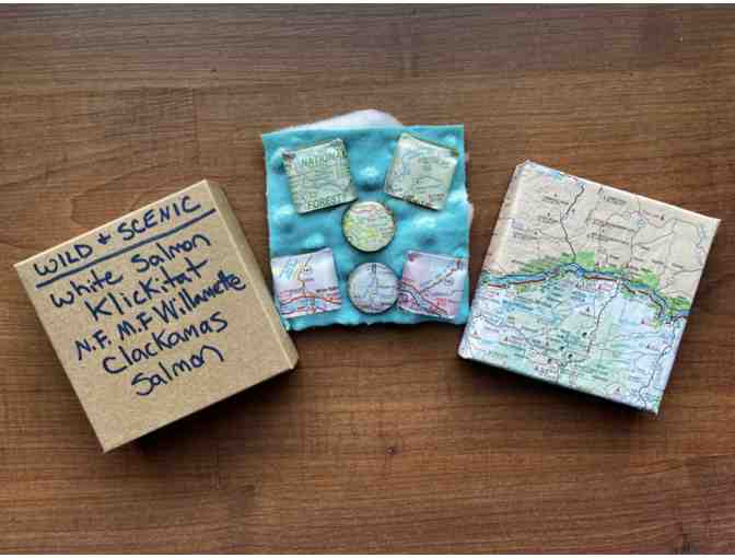 Homemade magnets of Wild & Scenic rivers, made from old maps! The map themed package comes with 5 magnets. Size of magnet is approximately 1 inch. This set includes White Salmon, Klickitat, NF MF Willamette, Clackamas, and Salmon. *some magnets may have small blemishes.