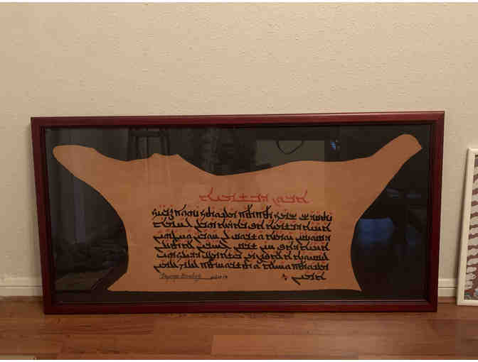 Authentic work by Dayroyo Boulus - Abun d´Bashmayo of the Lord's Prayer - Our Father - Vater Unser, written in Aramaic on leather and signed by the artist. He lives as a monk in Jerusalem, and he makes these pieces in an attempt to revive the language of Jesus.