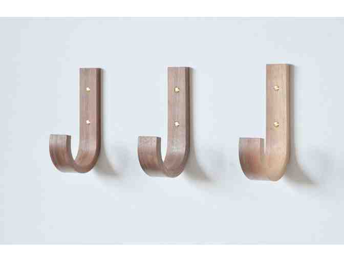1.5" wide x 7.5" tall Set of 3 steam bent walnut wall mounted hooks made with zero adhesives and biodegradable finish. True Bend Studio produces sustainably focused steam-bent furniture and lighting. Our pieces are minimally modified after bending, leaving an organic surface that celebrates the process.