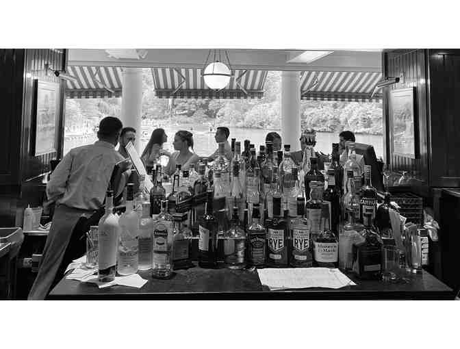 The viewer is in the Central Park Boathouse, oriented from just before the dining room bar looking south, through the dining space, through the open windows, across the lake and row boats, to the southern shore.