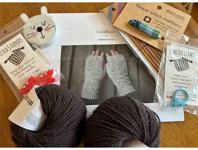 You will love the look and feel of these CLOUDBURST MITTS as you knit them with this beautiful chocolate brown cashmere yarn. The kit includes pattern, yarn and needles. We have also included items that will make you smile every time you are knitting, including fun stitch markers, stitch stoppers and Forest Animal Tape measure from the Yarn in the Farms shop. In addition enjoy shopping for your next project (in person or online) with the $50 gift card.