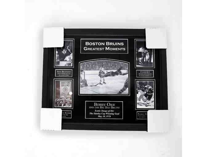 A 16"x20" framed photo of five of the Boston Bruins Greatest moments, including an iconic photo of Bobby Orr making the Stanley Cup Winning Goal on May 10th, 1970.