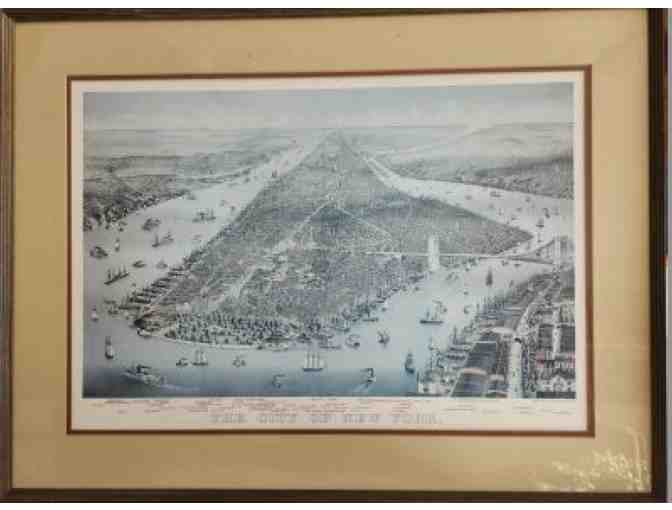 Currier & Ives old print under glass of New York City; 23"x 30" with gilded gold wood frame.