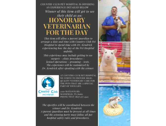 The Honorary Veterinarian For the Day experience will be coordinated between the winning bidder and Dr. Kendrick. A parent or guardian must be present at all times and the winning party must follow all pet hospital safety rules and procedures.