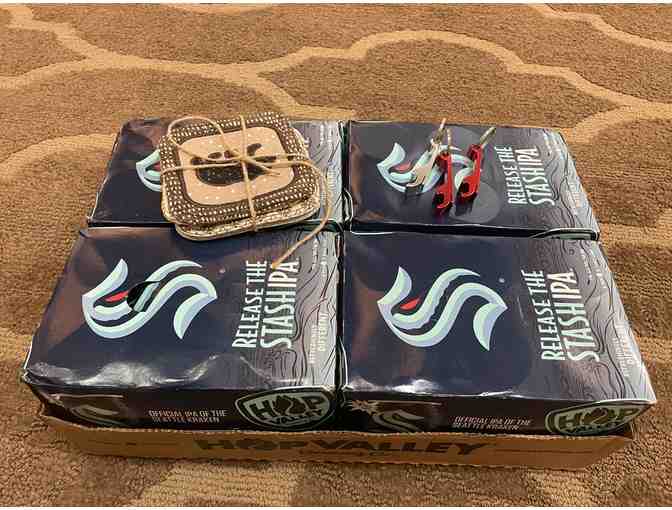 Case of Hop Valley "Release the Stash" IPA with bottle opener keychains and coasters made by our very own RMS Secretary, Helen Clough!