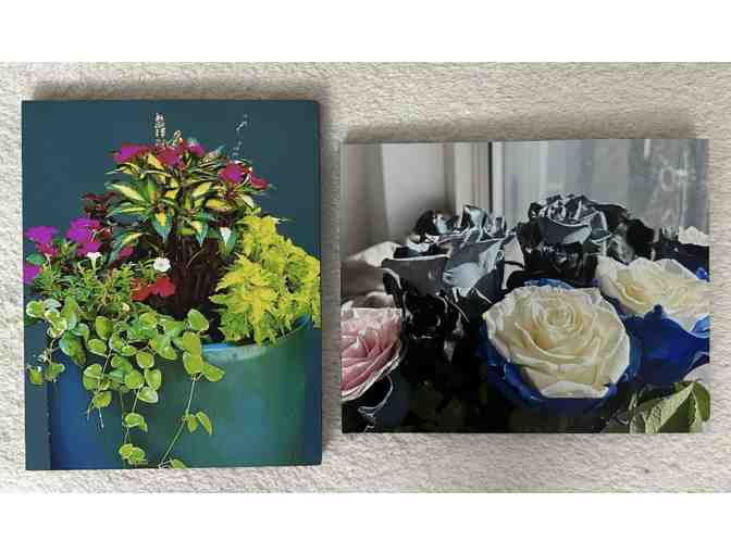 Color, color, color, who doesn't love flowers; pair of photographs professionally mounted on one-half-inch foam board ("gatorboard"). 8" x 10" and 10" x 10" with mounting hardware.