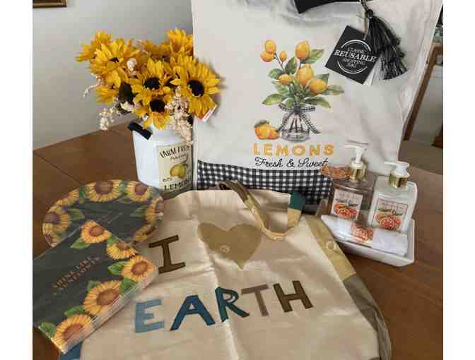 Two large and accommodating reusable cloth shopping bags are perfect for visiting farmer’s markets! And nothing says summer like sunflowers (paper plates, napkins and silk placeholders till you have the real blooms) and citrus (hand soap and lotion set and rustic metal milk can vase for market flowers).