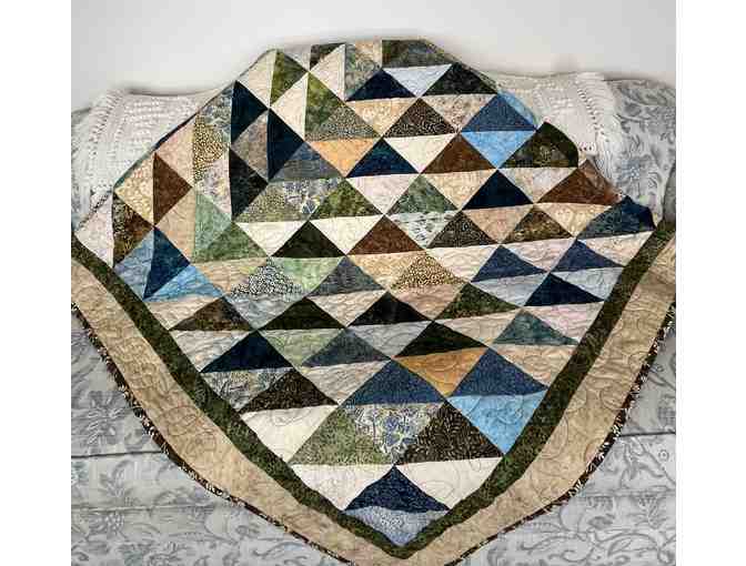 Lovely batik fabric quilt Size 79" x 90" pieced and donated by Barbara Sponem and the Ascension Quilters, and long arm quilted by Anza Myers of Quit Your Stitchin' in Grand Isle.