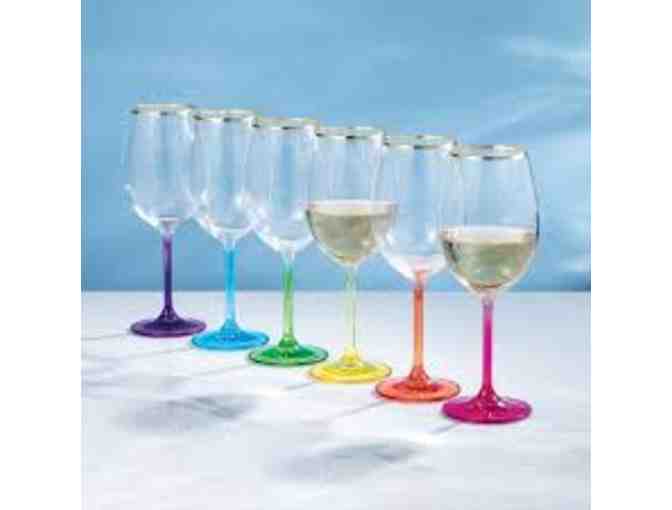 This stunning glassware is made by Luigi of Tuscany. Each glass is detailed with a 24k gold rim and colored stem. Handcrafted exclusively for Uno Alla Volta, from the heart and hands of the artisan. Hand wash. Set of 6. 9'' tall, hold 16 oz.