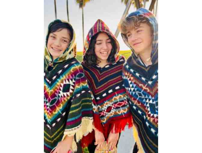Adult and kid alpaca poncho and Two matching hand embroidered leather bags made in Otavalo, Ecuador by local artisans.