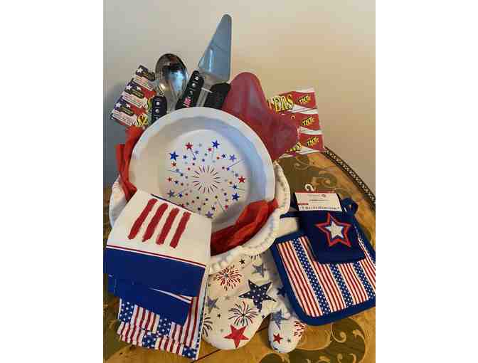 Just add apple pie to the celebratory pie dish—and watermelon and blueberries to the large white scalloped bowl—and you’re ready with desserts for the Fourth!