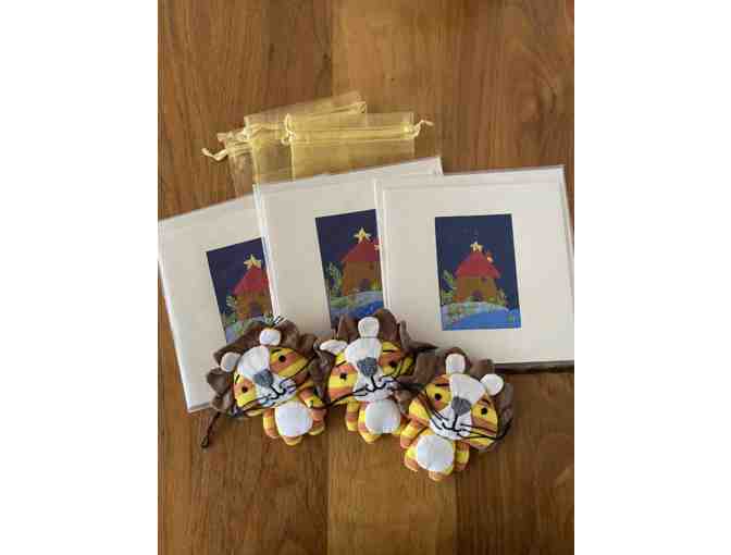Each individually “stitched” in Bangladesh, colorful Home Sweet Home cards (3) come with three fabric tiger ornaments (handcrafted in India) that you can choose to attach — a cheery greeting for every age.