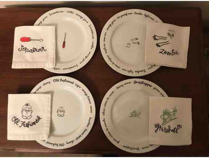 Each plate features a different cocktail, the ingredients and a simple image related to the drink. Each plate has a matching cotton, cocktail napkin