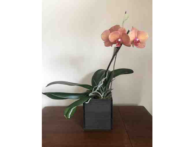 Planter is stained soft wood measuring 5 inches square and 5 3/4 inches tall
